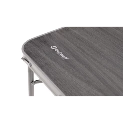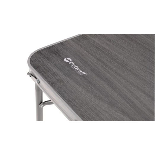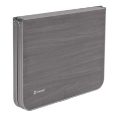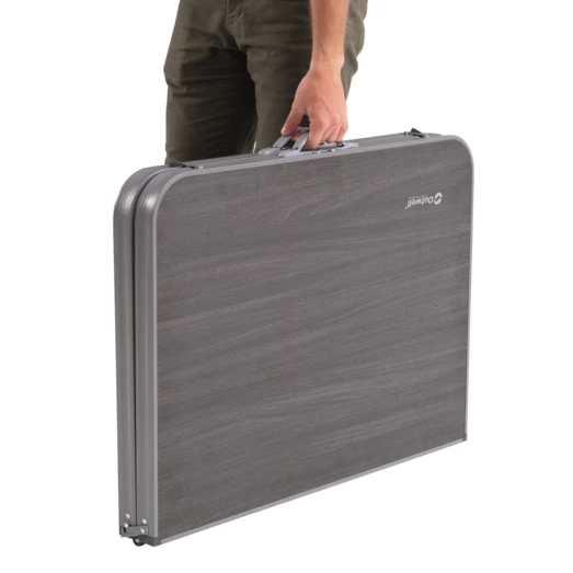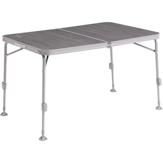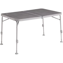 Foldbar campingbord i grå, designet til udendørs brug. Bordet har teleskopiske overdimensionerede aluminiumsben til nem, sikker højdejustering og flade fødder til bærende støtte. Ligeledes er bordpladen både UV-, vand- og varmebestandig.