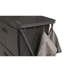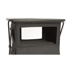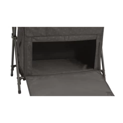 Sort campingskab med to store hylder, som gør det nemt at opbevare diverse ting på ferien. Skabet er foldbart og kan nemt åbnes og foldes sammen.