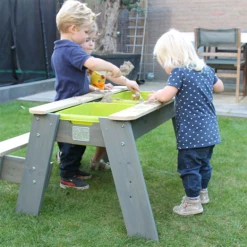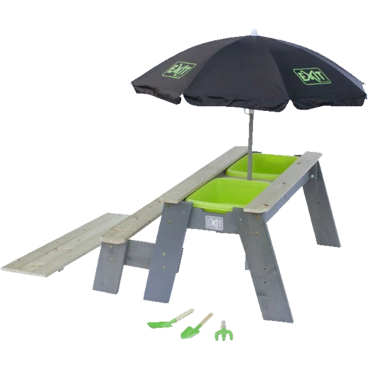 Hyggeligt sand-, vand- og picnicbord med 1 bænk fra Exit, er yderst funktionel og kan anvendes på mange forskellige måder. Lad børnene sidde på bænkene og nyde frokosten, lidt frisk frugt eller nogle kølende drikkevarer, eller find de krative ting frem og børnene kan sysler ude i det fri. Under picnicbordet er to udtagelige beholdere, hvor legetøj, sand eller vand kan placeres. Når bordpladen fjernes, åbner sig et hav af muligheder, hvor børnene kan slå sig løs med fantasifuld leg i sand og vand. Bordet giver dermed mulighed for leg og sansning på flere niveauer.