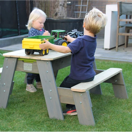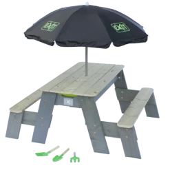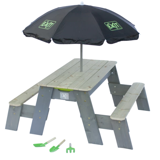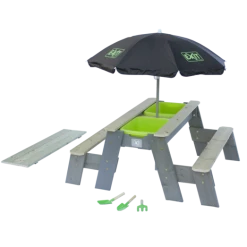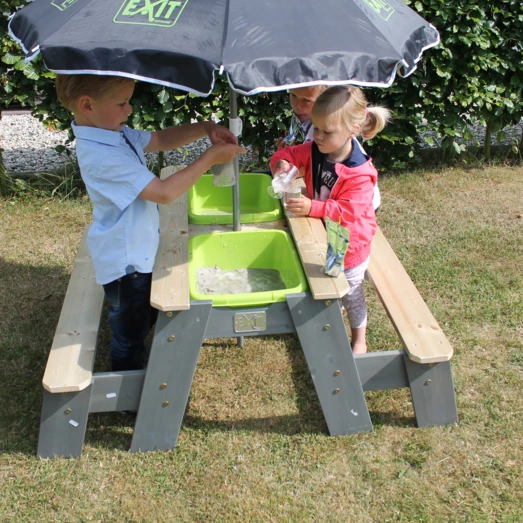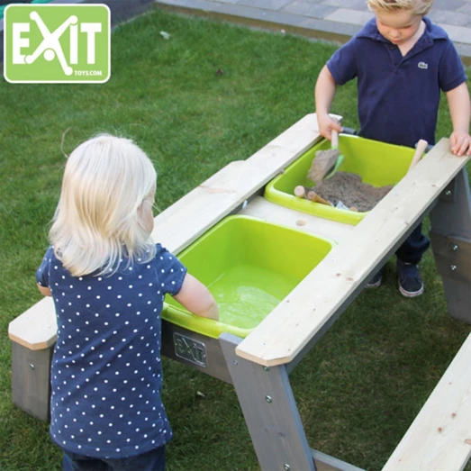 Hyggeligt sand-, vand- og picnicbord med 2 bænke fra Exit, er yderst funktionel og kan anvendes på mange forskellige måder. Lad børnene sidde på bænkene og nyde frokosten, lidt frisk frugt eller nogle kølende drikkevarer, eller find de krative ting frem og børnene kan sysler ude i det fri. Under picnicbordet er to udtagelige beholdere, hvor legetøj, sand eller vand kan placeres. Når bordpladen fjernes, åbner sig et hav af muligheder, hvor børnene kan slå sig løs med fantasifuld leg i sand og vand. Bordet giver dermed mulighed for leg og sansning på flere niveauer.