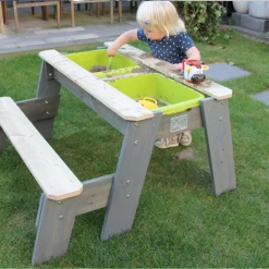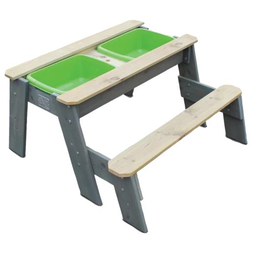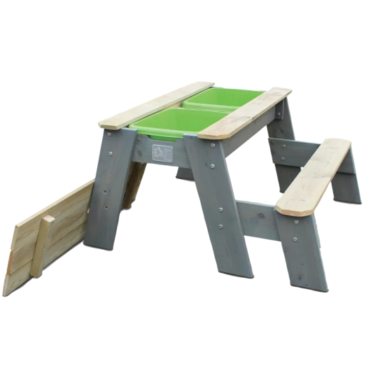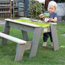 Hyggeligt sand-, vand- og picnicbord med 1 bænk fra Exit, er yderst funktionel og kan anvendes på mange forskellige måder. Lad børnene sidde på bænkene og nyde frokosten, lidt frisk frugt eller nogle kølende drikkevarer, eller find de krative ting frem og børnene kan sysler ude i det fri. Under picnicbordet er to udtagelige beholdere, hvor legetøj, sand eller vand kan placeres. Når bordpladen fjernes, åbner sig et hav af muligheder, hvor børnene kan slå sig løs med fantasifuld leg i sand og vand. Bordet giver dermed mulighed for leg og sansning på flere niveauer.