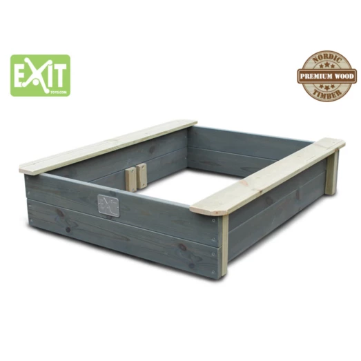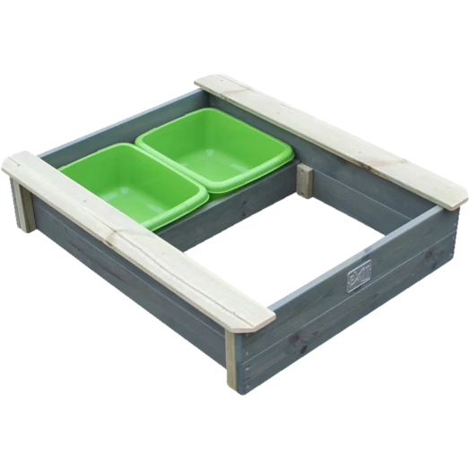 Exit sandkassen er fremstillet i holdbart cedertræ der er “imprægneret” fra naturens side og således beskyttet mod vind og vejr. Sandkassens sider er malet med vandbaseret maling, og bliver leveret med 2 grønne plastikbaljer til at have både sand og vand i, baljerne kan tages ud og vaskes, samt leveres sandkassen også med låg, så sandet kan holdes rent.