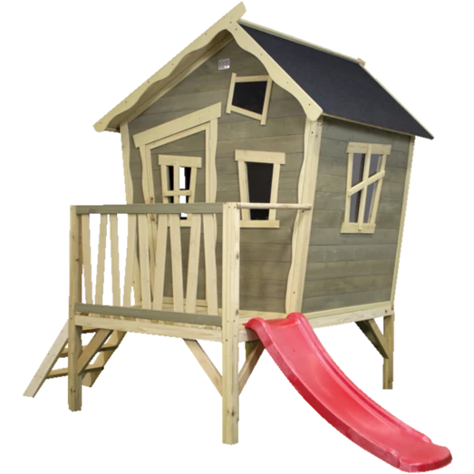 Exit Crooky 300 Er som navnet antyder et lidt crooky legehus. Med sine skæve vinkler og assymetriske vinduer og døre skaber det et indtryk af en rigtig hjemmebygget hytte. Børnene vil elske dette skæve hus der hurtigt vil blive deres favoristed når de skal lege med søskende og venner der er på besøg.