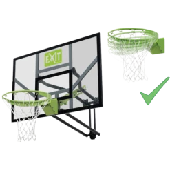 Denne basketballkurv kan monteres på en væg, hvilket gør det velegnet til ethvert sted. Den er enkel at montere og kan justeres til fem forskellige højder (230 – 245 – 260 – 285 – 305 cm). Exit Galaxy består af en bagplade (116 x 77 cm) af polycarbonat, en forstærket basketball ring (standard) med net og et vægbeslag, som du kan montere på væggen