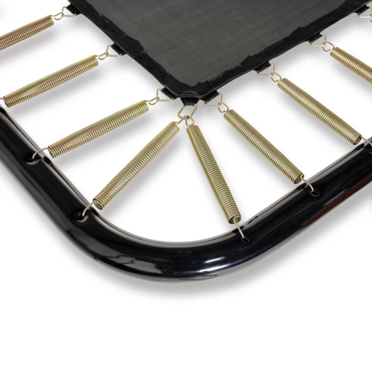 Trampolinen er både kraftig og slidstærk, så den kan holde til at blive brugt mange timer hver dag. Exit trampolinen har 4 ben af galvaniseret og pulverlakeret stål, springdug der sidder fast med hele 88 kraftige fjedre der måler 3,0 mm og kan klarer en maks belastning på 150 kg.