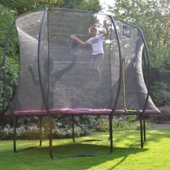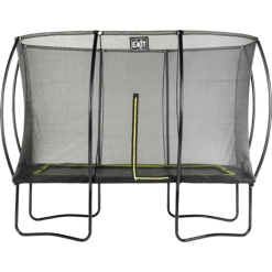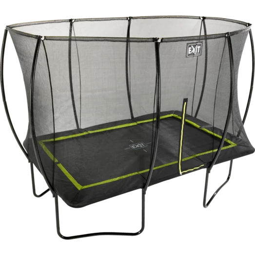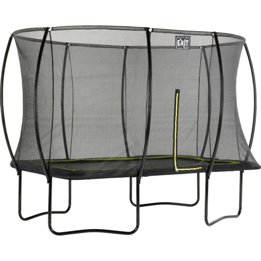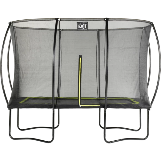 Silhouette trampolin fra Eixit - på benene er en kompakt rektangulær trampolin med en mat sort polstring og et sikkerhedsnet der leveres som standard med trampolinen på fødderne. Sikkerhedsnettet hænger meget stramt fra sine buede støtter, da dette er meget mere sikkert, da børn ikke kan blive viklet ind i nettert, men det ser også meget pænere ud i din have. Sikkerhedsnet har en iøjnefaldende neongrøn lynlås, så du nemt kan se, om lynlåsen er lukket korrekt.