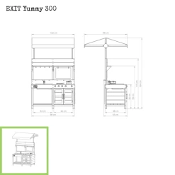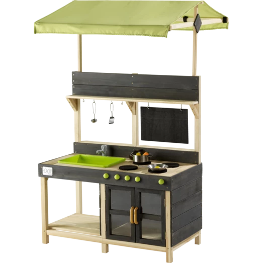 Praktisk udendørs legekøkken, der er særligt velegnet til børn i alderen 2-5 år. Køkkenet består af et komfur, en håndvask med vandhane og opbevarings plads. Udendørskøkkenet har et komfur med drejelige knapper og en ægte vandhane, da det er muligt at tilkoble haveslangen til vandhanen, så man derved får en funktionel vandhane. Vandhanen fungerer ved at fastgøre din haveslange til den, og fordi vasken er aftagelig kan vandet let hældes ud efterfølgende.