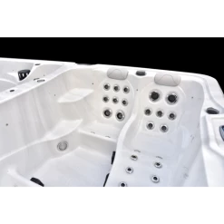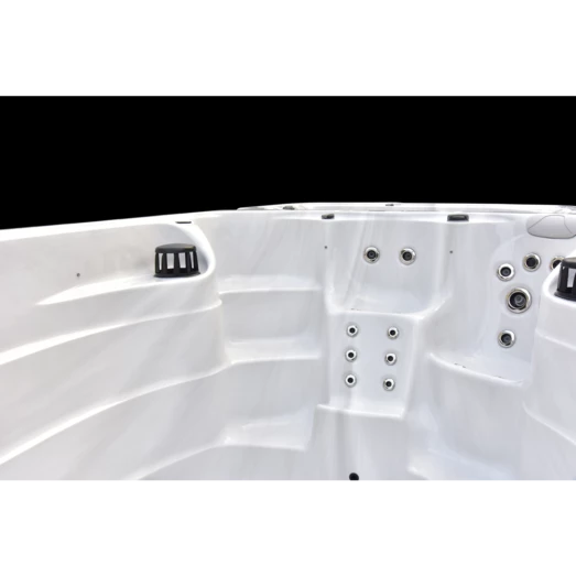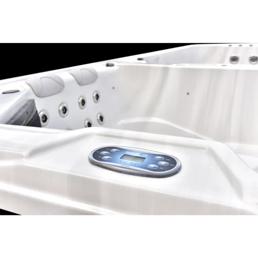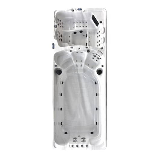 Spa-området er fremstillet med 1 loungesæder, 3 siddepladser og har en kapacitet på 8.500 liter. Hvor svømme-området er fremstillet med 4 kraftfulde swimdyser, der skaber modstrøm i badet. Dette område er derfor særlig velegnet til svømmetræning, genoptræning eller som badning og leg til børnene. En lækker detalje ved opdelingen af områderne er, at det er muligt at have to forskellige temperatur i de to dele. Du kan således læne dig tilbage og nyde 40 graders varmt vand og bobler, mens børnene svømmer rundt i 25 graders vand ved siden af.