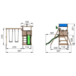 I Jungle Gym Hut legetårnet er du i læ for sandstorme under det skrå presenningtag. Stigen fører op til platformen, hvor der er en ståhøjde på over 160 cm, og i bunden af legetårnet findes en sandkasse, som er placeret i skygge og hvor flotte sandslotte kan tage form. Lad børnene benytte sig af gyngemodul med 2 gynger, hvor de kan få sig en rigtig sjov gyngetur og mange sus i maven.