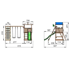 Lille legetårn med sjove aktiviteter – I Jungle Gym Hut legetårnet er du i læ for sandstorme under det skrå presenningtag. Benyt stigen der fører op til platformen, hvor der er en ståhøjde på over 160 cm, eller bestig legetårnet med klatrevæggen til toppen, hvorefter turen ned kan leges som en edderkop i klatrenettet eller ned ad den bølgende rutsjebane. Når jorden igen nås kan en tur på gyngen give et dejligt sus i maven og legen kan fortsætte i bunden af legetårnet hvor der findes en sandkasse, som er placeret i skygge og hvor flotte sandslotte kan tage form