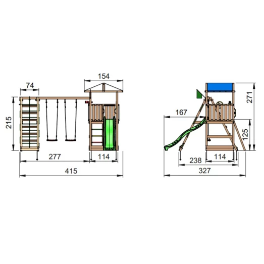 - Legetårnets mål Areal ekskl. sikkerhedsareal legetårn: B:318 x D:160 cm x H: 286 cm