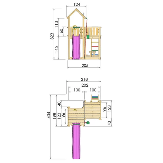 - Legetårnets mål Areal ekskl. sikkerhedsareal: B:404 x D:218 x H: 323 cm