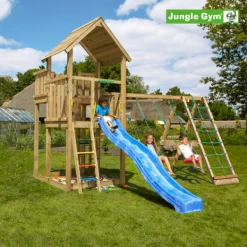 Jungle Gym legetårn leveres som komplet “saml selv” pakke i færdigsavede trælængder, med rutsjebane og sandkasse, samt er legetårnet testet og overvåget for kvalitet og sikkerhed (i henhold til EN: 71-1, 2, 3, 8 & 9) CE godkendt.