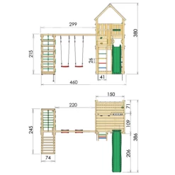 Inkl. klatremodul med 2 gynger, klatrevæg, klatrenet, stige, 1-step stige, periskop, blå rutsjebane 265 cm og sandkasse.