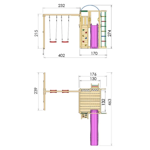 - Legetårnets mål Areal ekskl. sikkerhedsareal legetårn: B:392 x D:176 x H: 274 cm