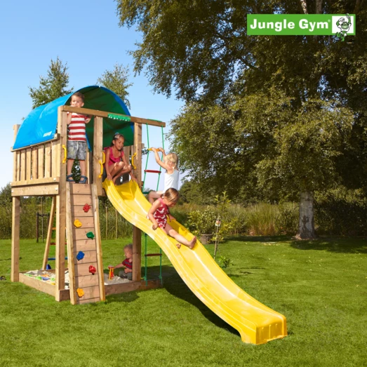 Inkl. klatrevæg, gul rutsjebane 265 cm, klatrereb, stige, 1-step stige samt sandkasse.