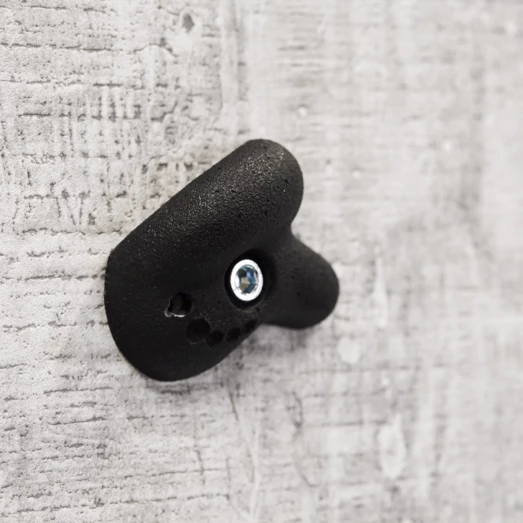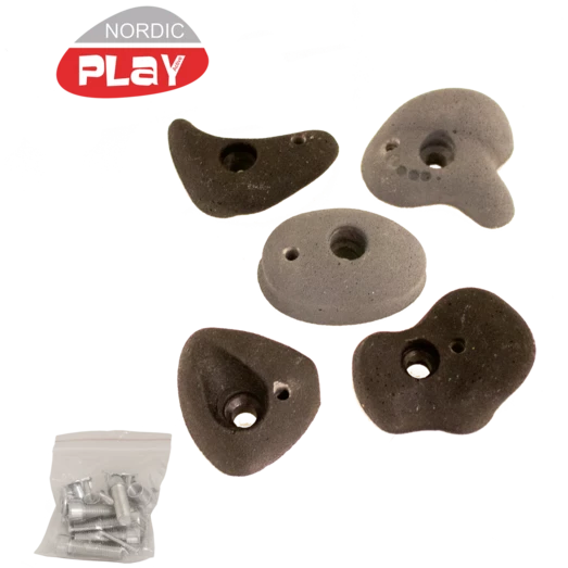 NORDIC PLAY Klatresten fremstillet i polyresin i sort/grå farve. Klatrestene er inklusiv skruer og møtrikker til fastgørelse i træ eller på en gipsvæg. Klatregrebene i polyresin giver perfekt greb og er pålidelige og har mange anvendelsesmuligheder. De kan både bruges til gipsvægge indenfor på f.eks. børneværelset og kan også bruges i forbindelse med en trævæg eller klatrevæg på et legetårn. Vi anbefaler fastgørelsen sker i træ – alternativt en vandfast krydsfinérsplade eller en gipsvæg. De kan med fordel anvendes på træ i tykkelsen 16-22 mm. De 5 Klatresten er i forskellige former og størrelser.