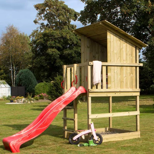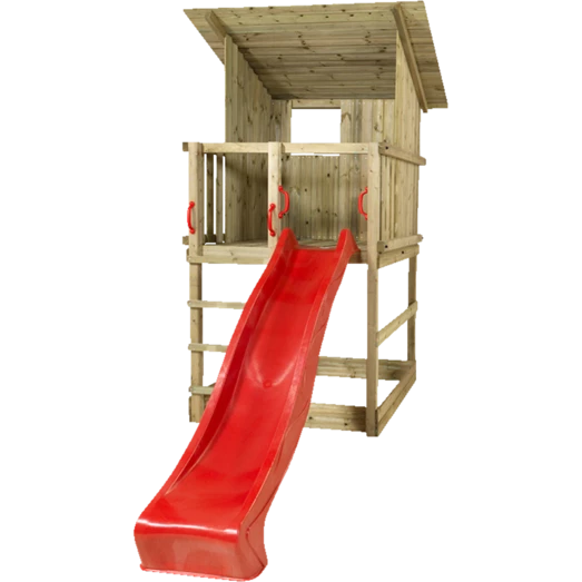 Plus Play legetårn leveres som komplet “saml selv” pakke inkl. rustjebane, røde greb, jordankre, karbinhager og samlebeslag samt kan legetårnet bund anvendes som sandkasse.