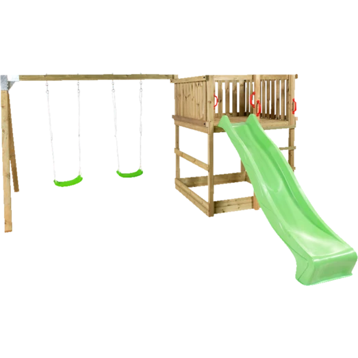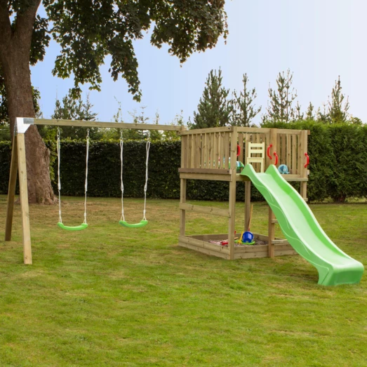 Plus Play legetårn leveres som komplet “saml selv” pakke inkl. rustjebane, røde greb, jordankre, karbinhager, samlebeslag og gynge, samt kan legetårnet bund anvendes som sandkasse.