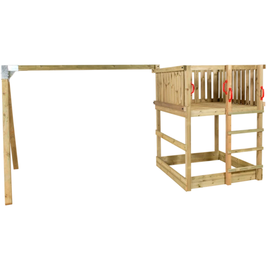Plus Play legetårn leveres som komplet “saml selv” pakke inkl. røde greb, jordankre, karbinhager og samlebeslag, samt kan legetårnet bund anvendes som sandkasse.