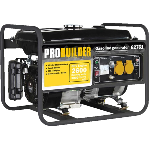 Kraftfuld Probuilder benzin-generator med 4-takts motor. Den har udtag til 230 Volt (AC) samt 12 Volt (DC).