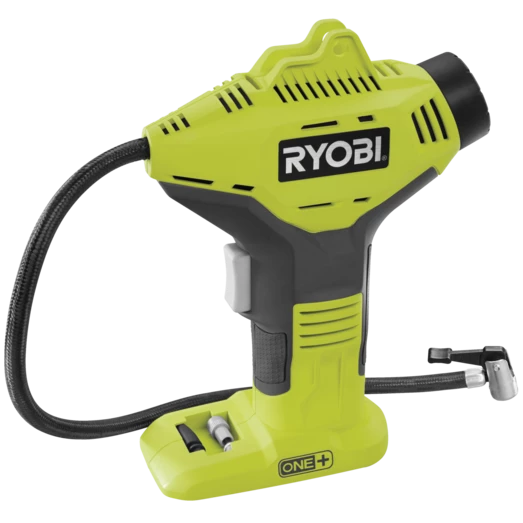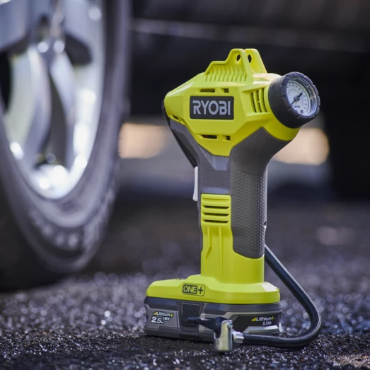 Egenskaber for Ryobi R18PI-0 akku minikompressor 18V - Ideelt til pumpning af bildæk, cykeldæk eller sportsbolde. Kan pumpe et bildæk op til 32 psi på bare 2 minutter.