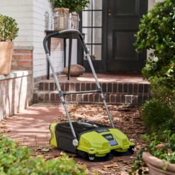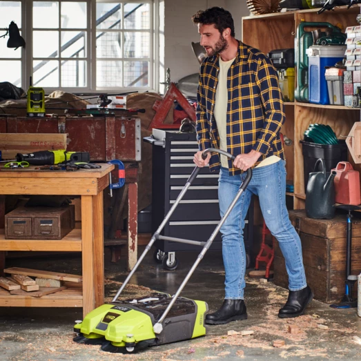 Ryobi One+ fejemaskine er udstyret med to hurtiggående børster centrerer der effektivt samler affald i en arbejdsbredde på 53 cm.
