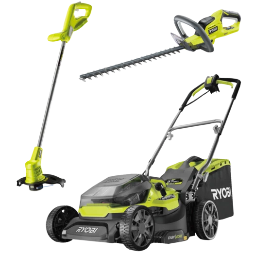 Super lækkert sæt med Ryobi RY18LMH37A plæneklippper, Ryobi OLT1825 græstrimmer og Ryobi OHT1845 aku hækkeklipper samt 2 x 5,0 ah batteri og lader. PLæneklipperen kan er en hybrid maskine som enten kan køre på el (230v) eller ved at benytte de to medfølgende batterier. Hybrid plæneklipper med 18V giver den batteridrevne frihed, samt giver mulighed for at tilslutte strøm.