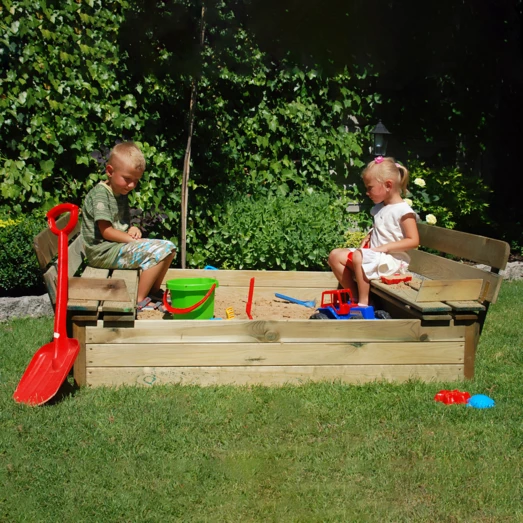 Lad dine børn udforske havens univers og få mange timers glæde udenfor. En sandkasse kan være med til at styrke barnets kreativitet og samtidig får de masser af frisk luft. Sandkassen er fremstillet i trykimprægneret fyrtræ, samt kan sandkassen låg klappes op, så de kan anvendes som sæder med ryglæn eller anvendes som låg, når sandkassen ikke er i brug. Vi anbefaler der tilkøbes 12 x 20 kg sandkasse sand.