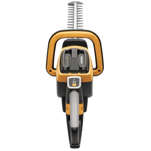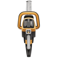 Batteridrevet hækkeklipper med dobbeltsidet kniv på 58 cm, 180° drejbare håndtag for mindre belastning og støtter under hækkeklipperen.