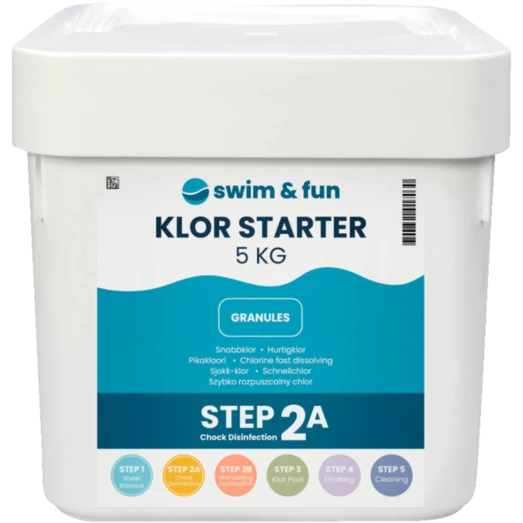Klor Starter til hurtig og effektiv desinficering af poolvand. Klor Starter kan med fordel anvendes når poolen lige er blevet fyldt, eller når der er opstået belægninger eller mat og uklart vand. Vandet tilføres en højere dosis desinfektionsmiddel end normalt for effektiv desinficering. Granulatet indeholder stabilisator, som modvirker nedbrydning fra solens UV-stråler.
