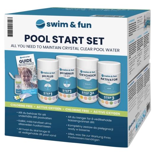 Med dette pool start-sæt er du sikker på at komme godt i gang med badesæsonen. Sættet indeholder alle de plejemidler, der er nødvendige for at holde vandet i poolen rent og indbydende, samt en overskuelig og informativ guide.