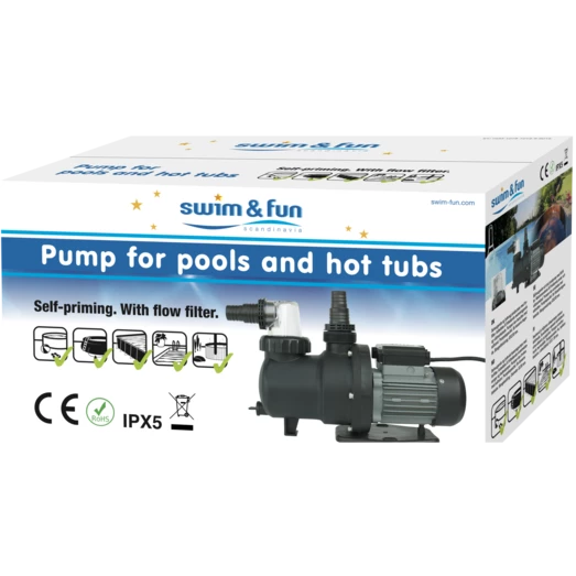 Lydsvag og selvsugende pumpe med forfilter, der anvendes til cirkulering af badevand i mindre havebassiner, pools og spabade på op til 22.500 L og fritstående havebassiner op til 22 m³.