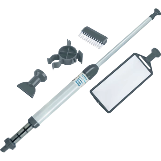 Sættet inkluderer børste, overfladeskimmer, en bred og en smal sugedyse samt praktisk vægophæng.