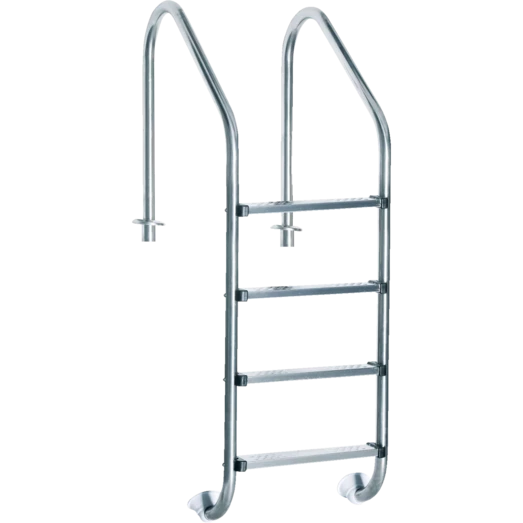 Inground stige med 4 skridsikre trin. Stigens fire trin er belagt med en skridsikker belægning for din sikkerhed. Stigen monteres i f.eks. fliser eller terrasse omkring poolen. Beslag til montering på flisekant eller terasse medfølger.